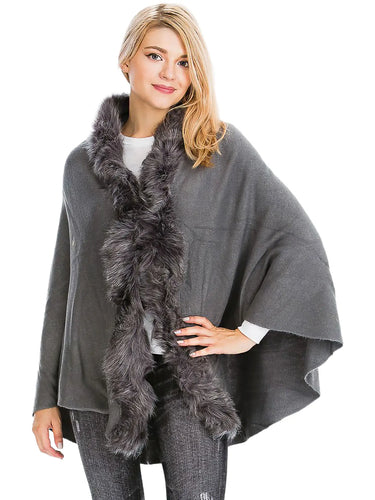 5747-Luxe Faux Fur Trim Shawl Cape-GREY