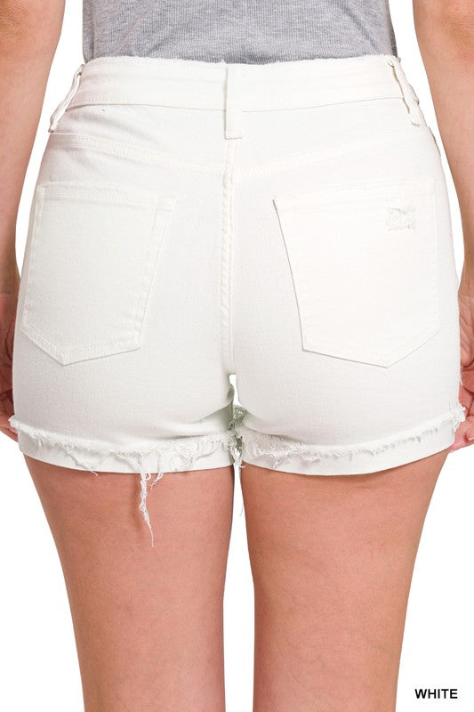 3190-DISTRESSED RAW HEM WHITE DENIM SHORTS