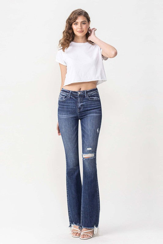 HIGH RISE FLARE COMFORT STRETCH DENIM, SLIM FLARE, HIGH-WAISTED, KICK FLARE, F. RISE: 10" / INSEAM: 34' / LEG OPENING: 21' Model is 5' 9'' and wearing size 26