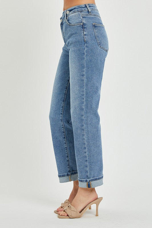 HIGH RISE CROSS OVER STRAIGHT LEG JEANS - Rise 10" | Inseam 29'5" in size 3/26 - Model Info: Height 5'8" | Waist 24" | Hips 34"