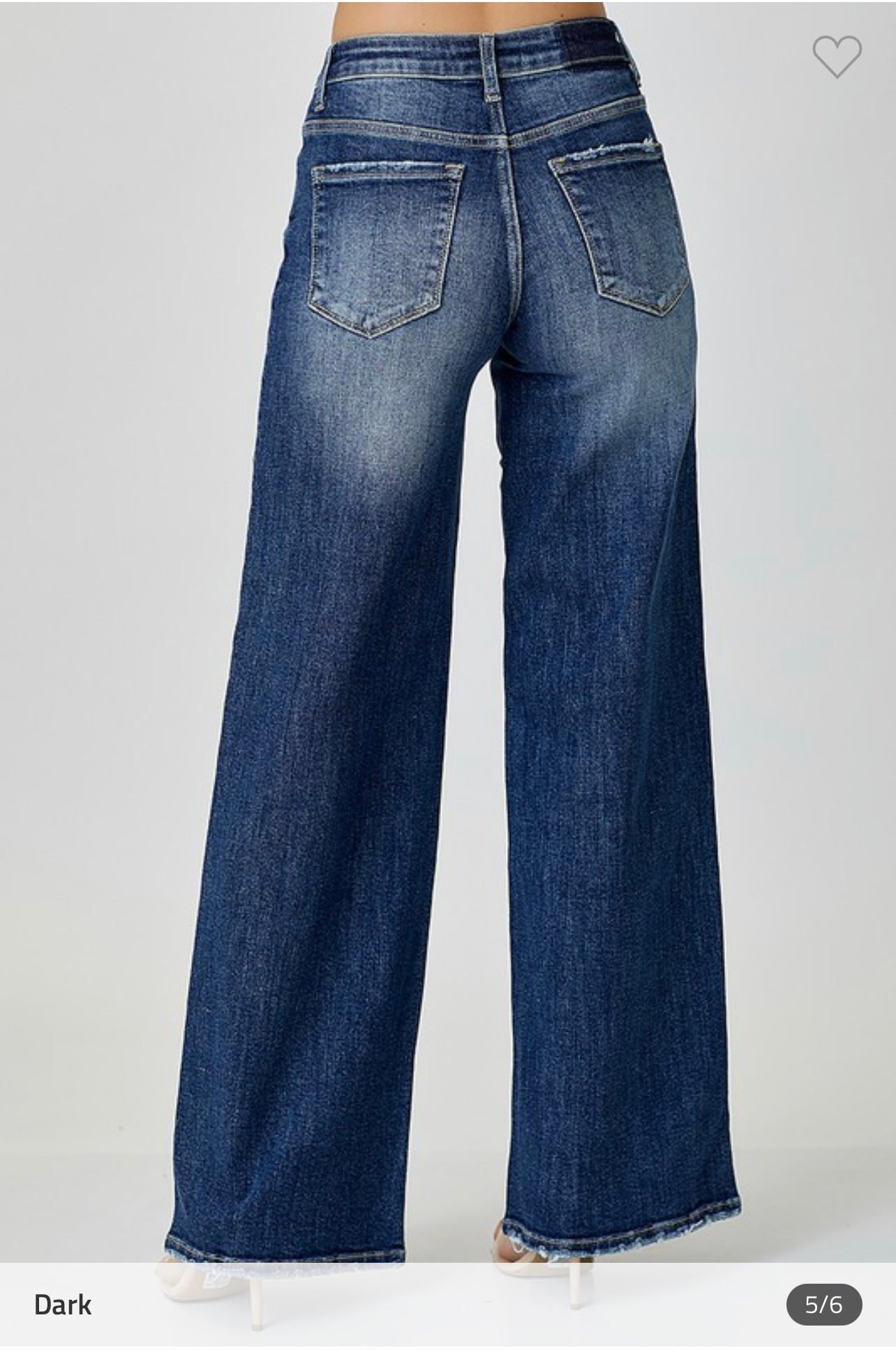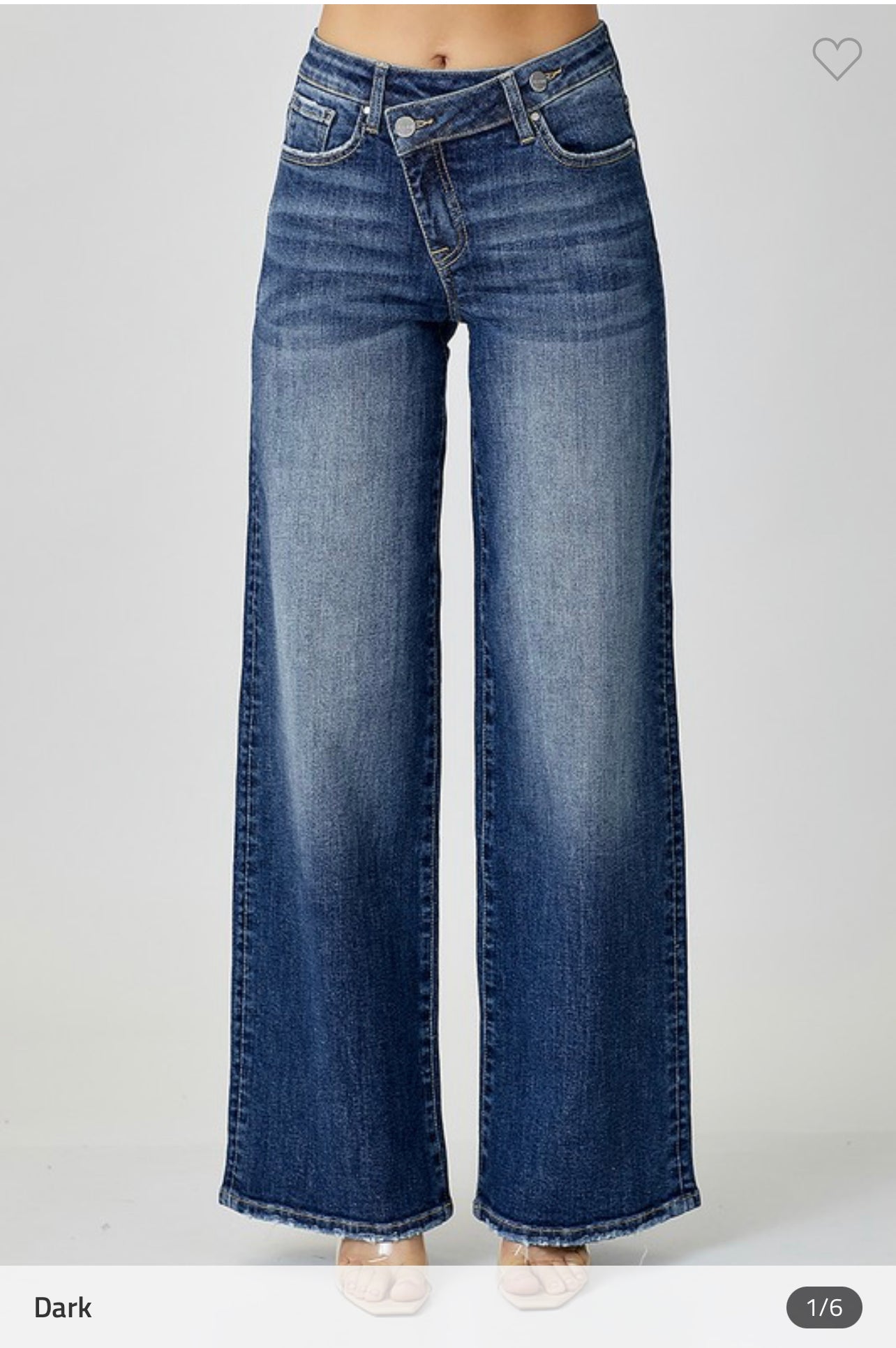 MID RISE CROSSOVER WIDE LEG JEANS - Rise 9'5" | Inseam 32'5" in size 3/26 - Model Info: Height 5'8" | Waist 24" | Hips 34"