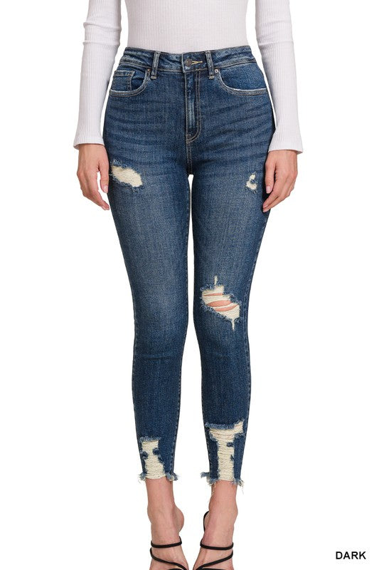 DISTRESSED HEM ANKLE SKINNY DENIM PANTS - GOOD STRETCH DENIM FRONT RISE: 10.5", INSEAM: 27" approx. LEG OPENING: 8.5" approx. MODEL IS 5'9" WEARING SIZE 27 ** COLOR MAY VARY SLIGHTLY DUE TO MONITOR RESOLUTION