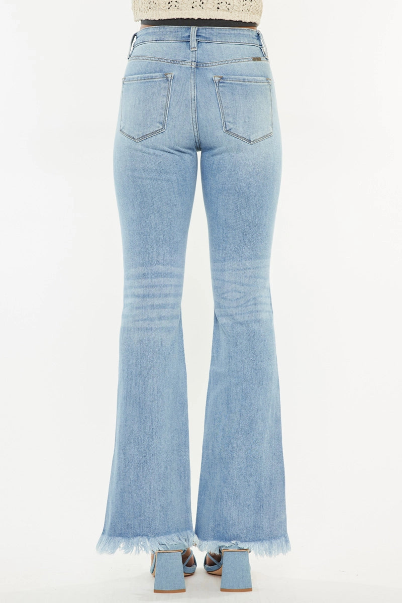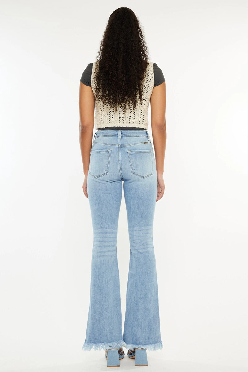 high rise leg distress bootcut jeans Light wash Stretch Twisted seam Raw frayed hem Front distress Zip fly Rise 10.5" inseam 32" in size 5/26 94% cotton, 5% polyester, 1% spandex
