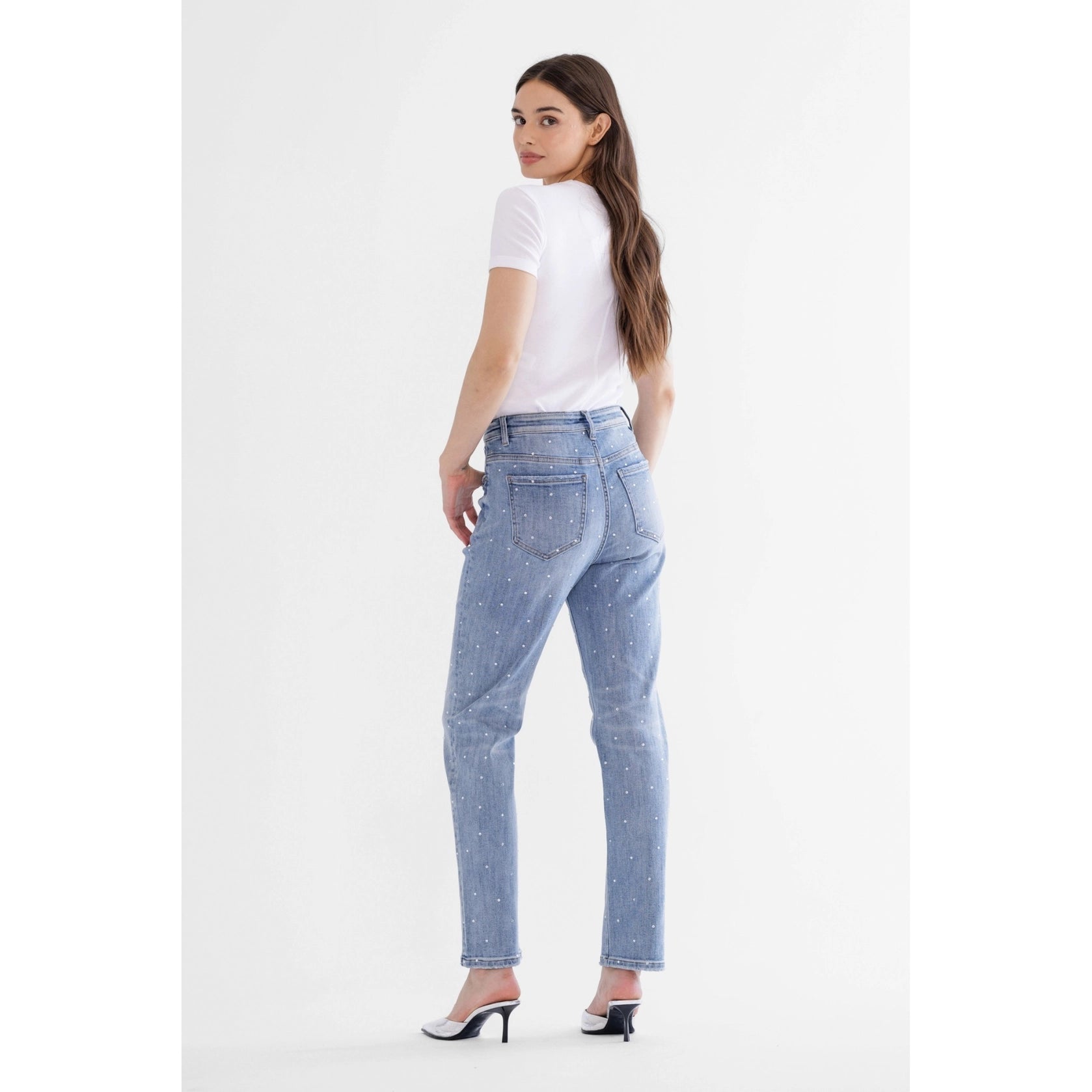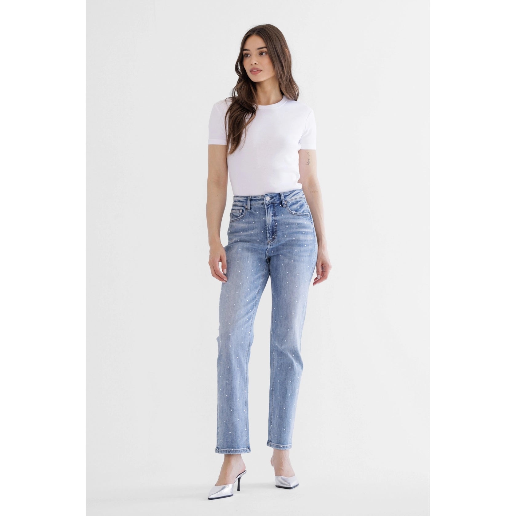 Super high straight w/rhinestone 94% cotton, 4.5% poly, 1.5% spandex Front rise: 11" Inseam: 30" Leg opening: 14 3/4"