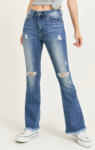 3139-RISEN HIGH RISE DISTRESSED RAW HEM FLARE