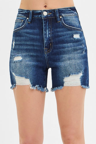 5074- RISEN High Rise Distressed Mid Thigh Shorts-DARK