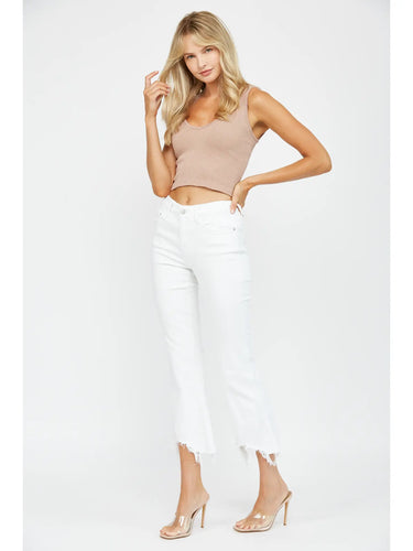 4160-High Rise Crop Flare with Uneven Hem-WHITE