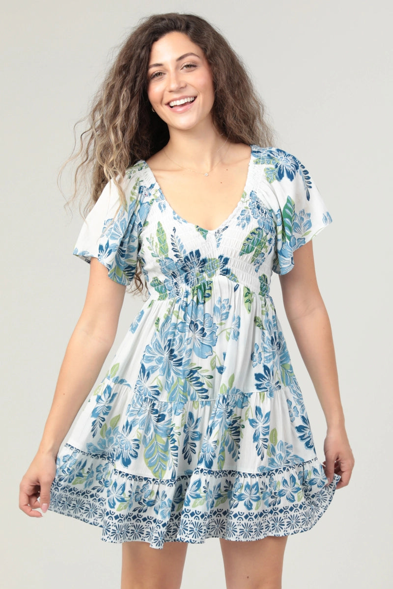 5294-V Neck Smocked Bust Dress-SHORT SLV-BLUE