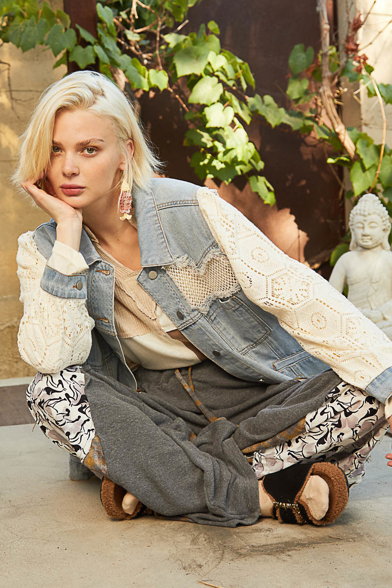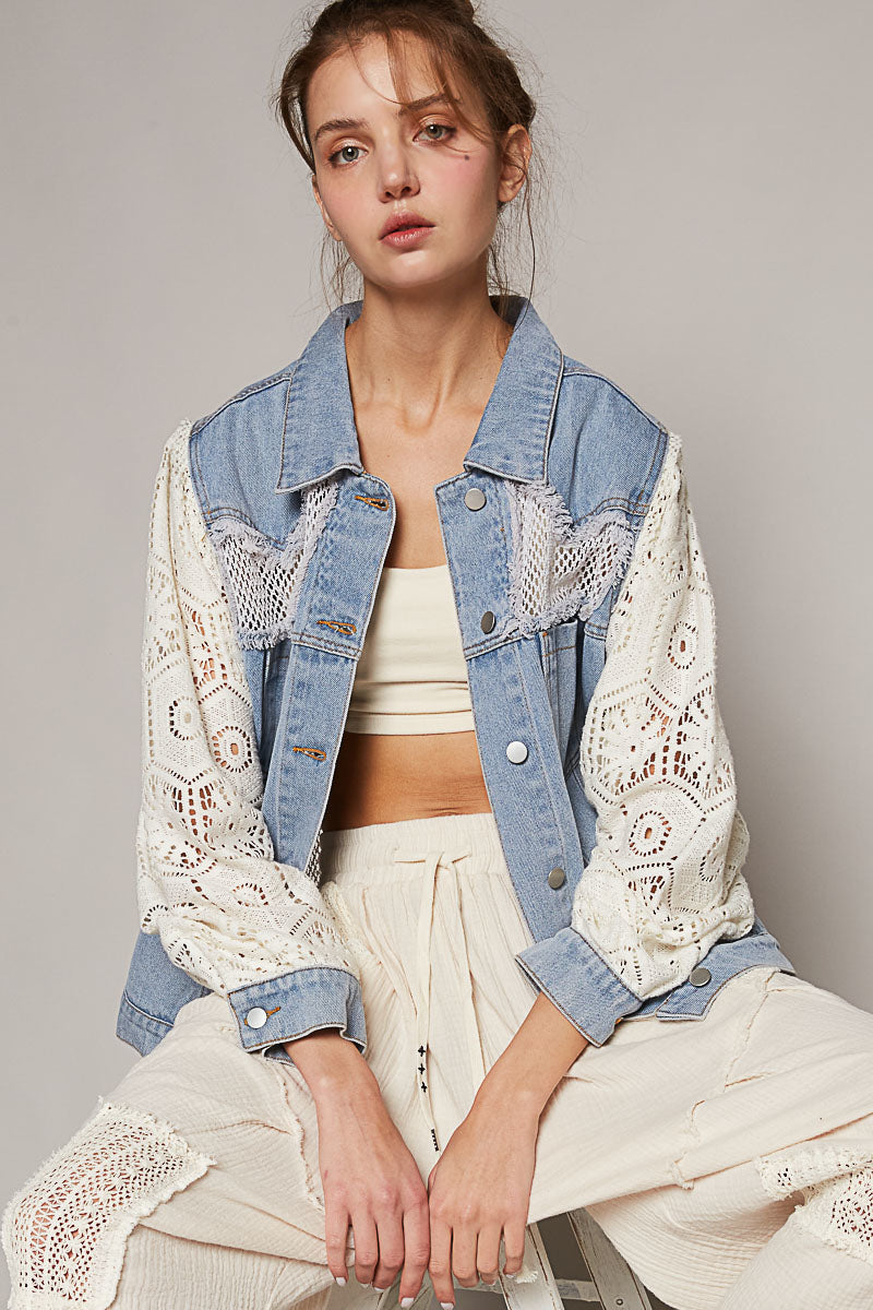 Designed in long sleeve regular fit jacket top in denim with outseam, crochet see through patch, front pocket, vintage washing, solid color.