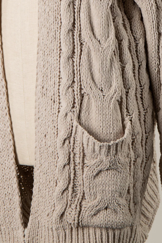 LONG SLEEVE BRAID CABLE KNIT CHENILLE CARDIGAN WITH PATCHED POCKETS
