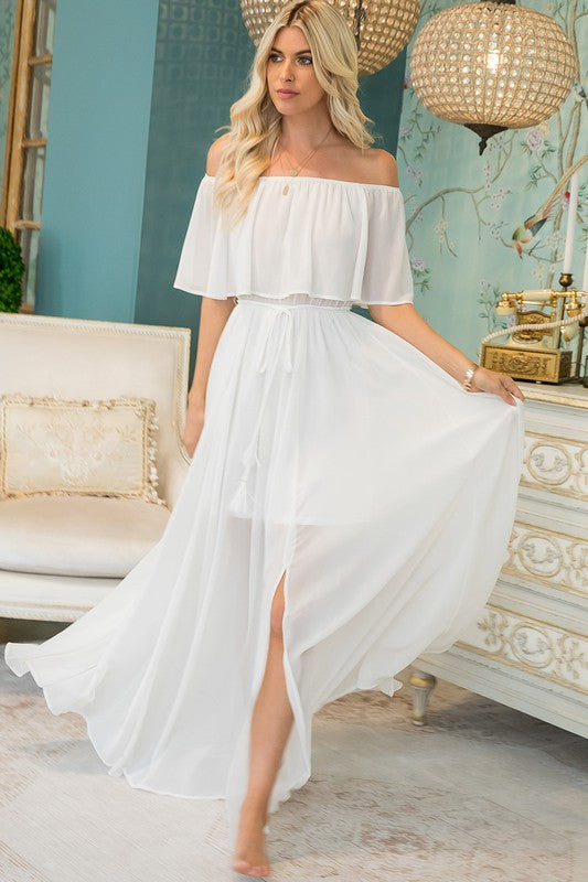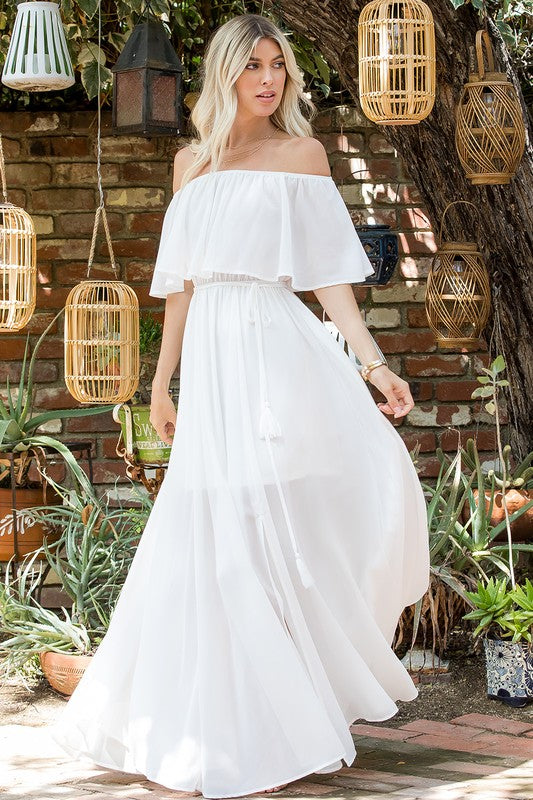 Romantic ruffled off the shoulder maxi dress, drapes beautifully. This sweet maxi dress features an elastic off the shoulder neckline with elastic waist with self tie string.