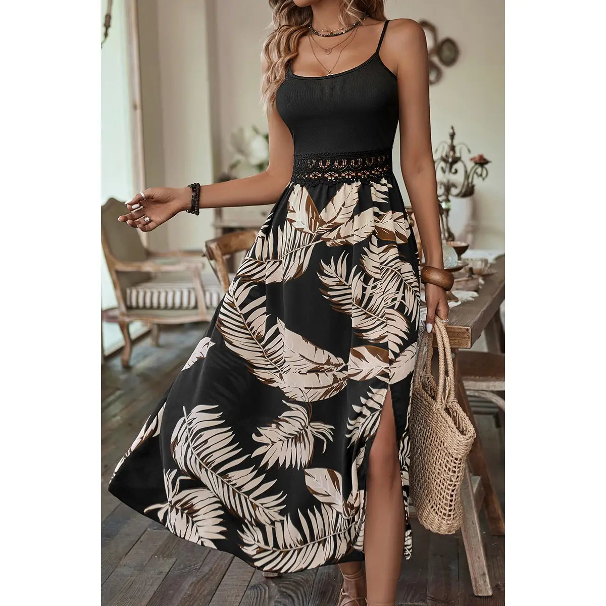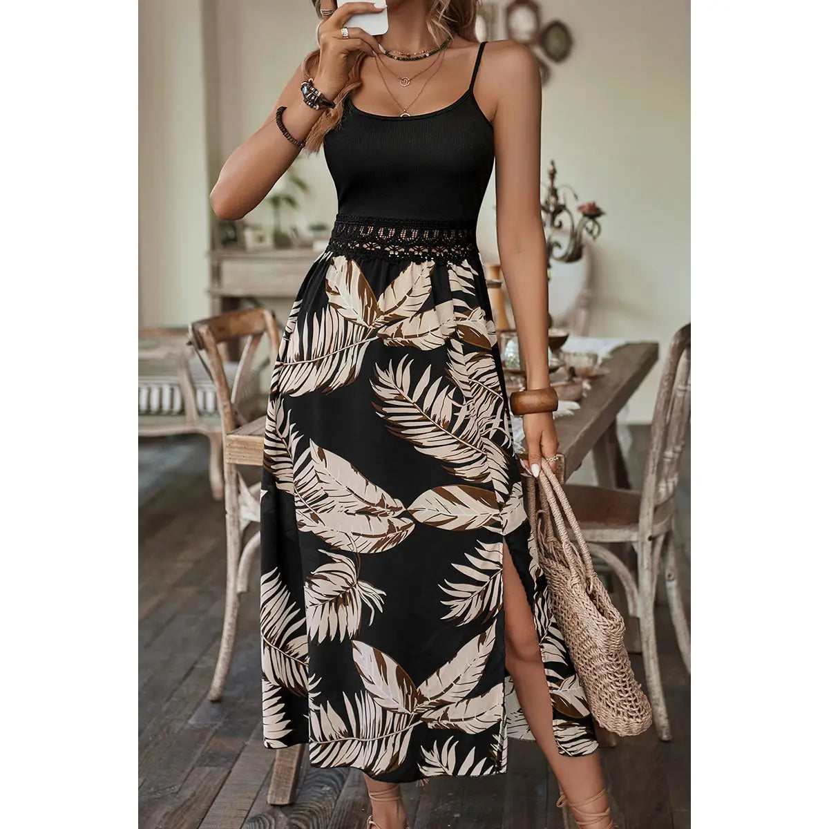 5133-Tropical Print Guipure Lace Insert Split Dress