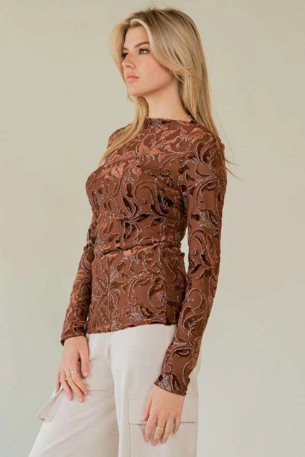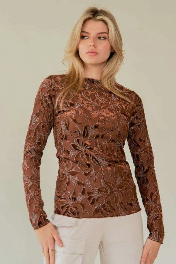 5523-Mesh Patern Printed Long Sleeve Layering Top-BROWN