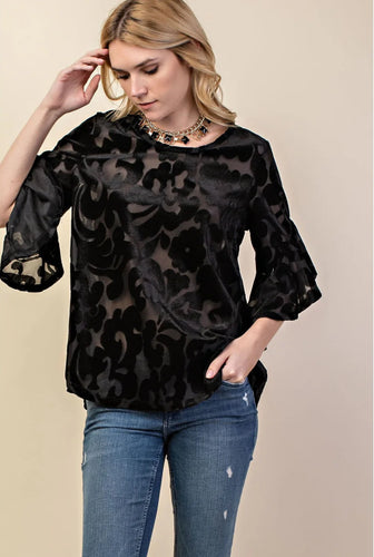 5497-Velvet Ruffle Sleeve Knit Top-BLACK