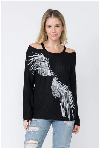 5493-Cold Shoulder Long Sleeve Knit Top-BLK/GREY