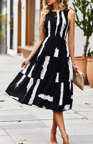 4980-Floral Print Cut Out Ruched Fit Sleeveless Ruffle Dress-BLACK