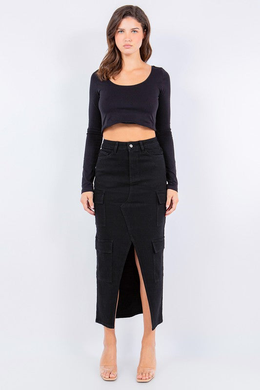 3704-CARGO POCKET DENIM MAXI SKIRTS-BLACK