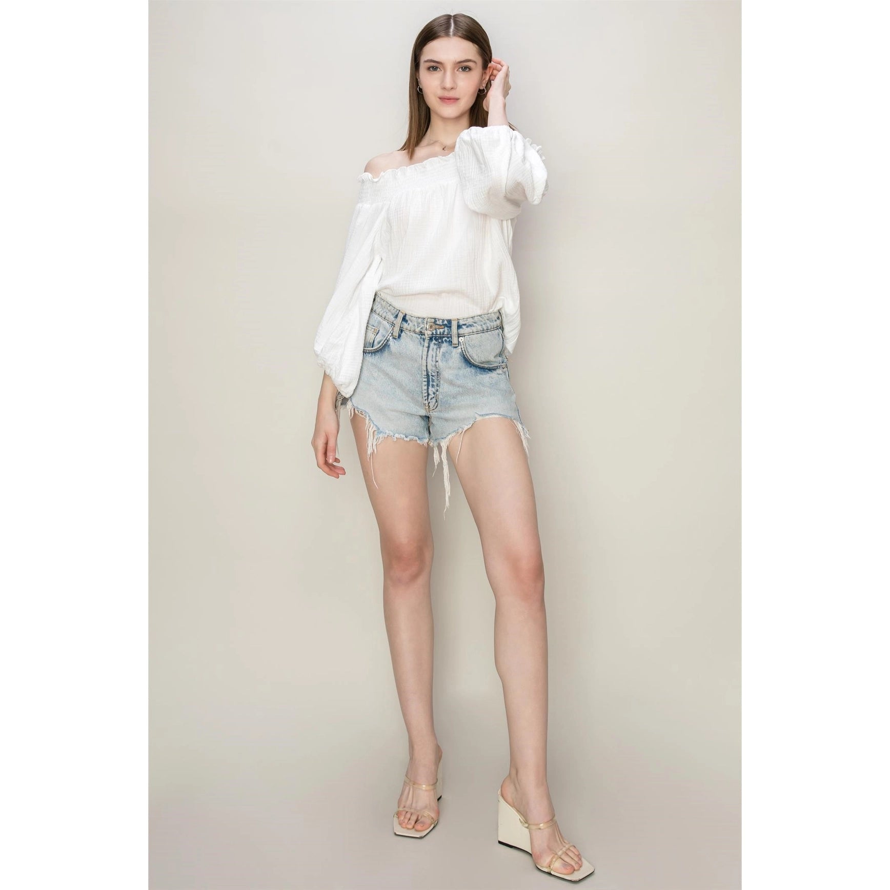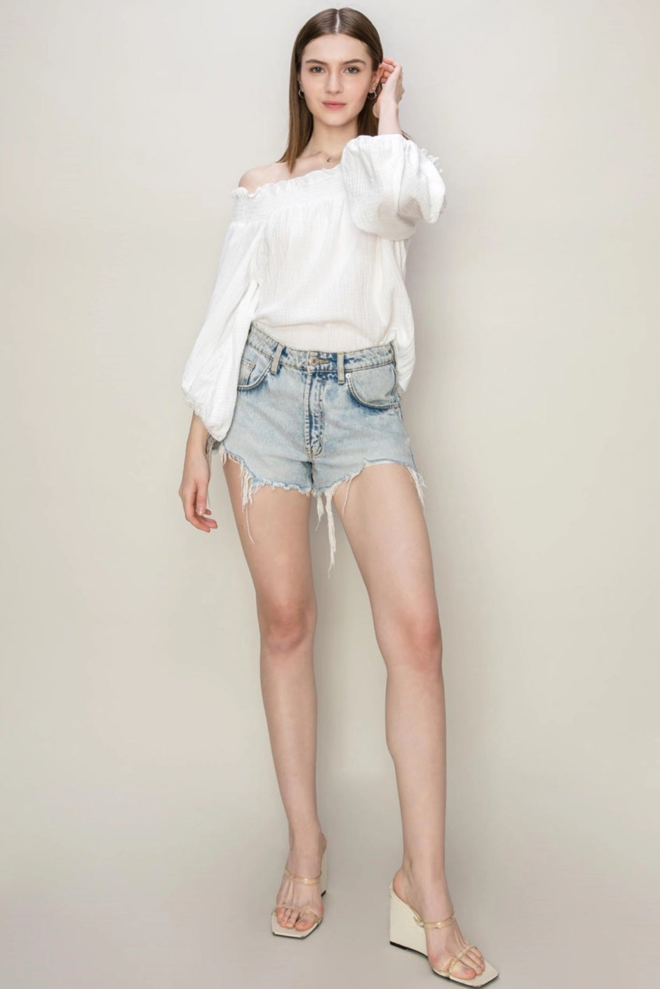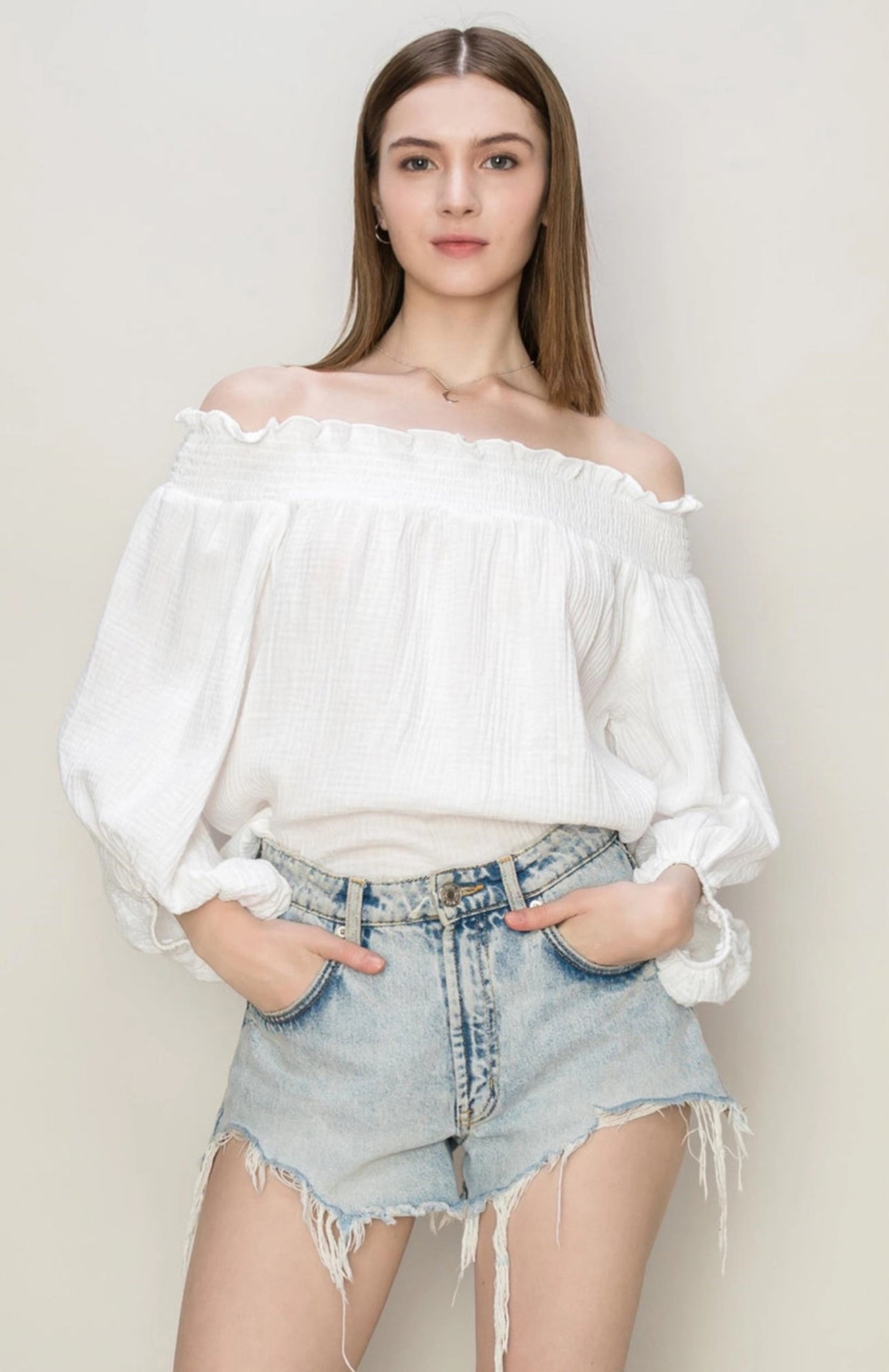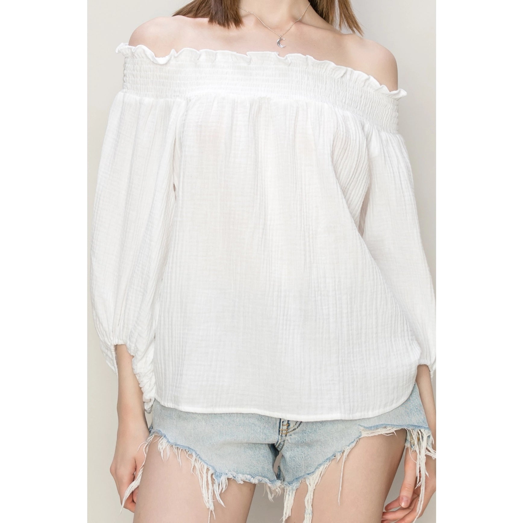 DOUBLE GAUZE FABRIC, TOPPED WITH A RUFFLED SMOCK OFF-SHOULDER NECK FOR A ROMANTIC LOOK. BALLOON SLEEVES WITH ELASTICATED CUFFS ADD DEFINITION, COMPLETE WITH A RELAXED BODICE.