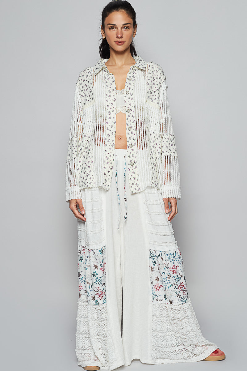 Designed in regular fit long sleeve shirt top in print double gauze with crochet see though patch, front pockets, vintage washing, floral pattern.