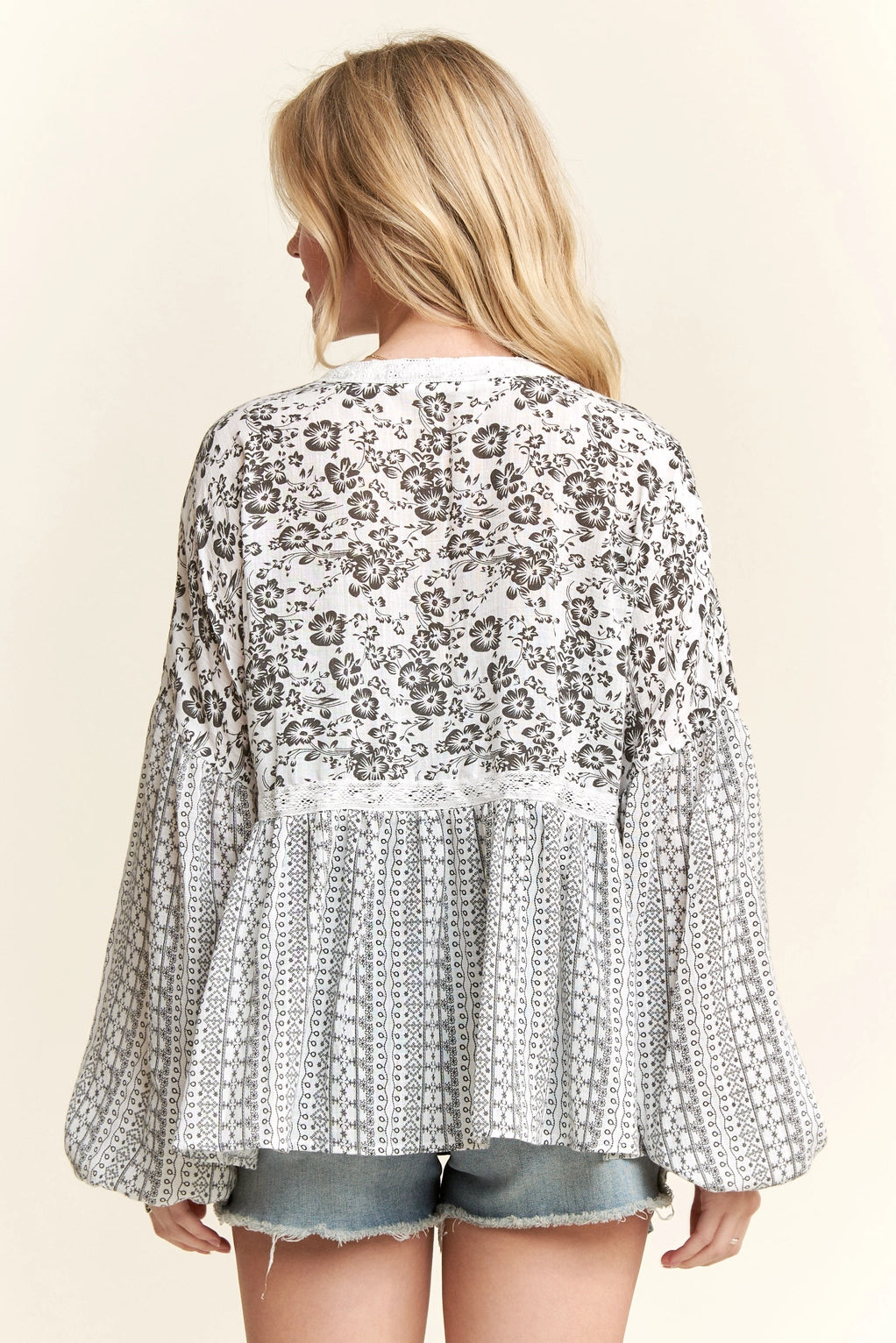 BOHO FLORAL PEASANT BLOUSE WITH LACE TRIM