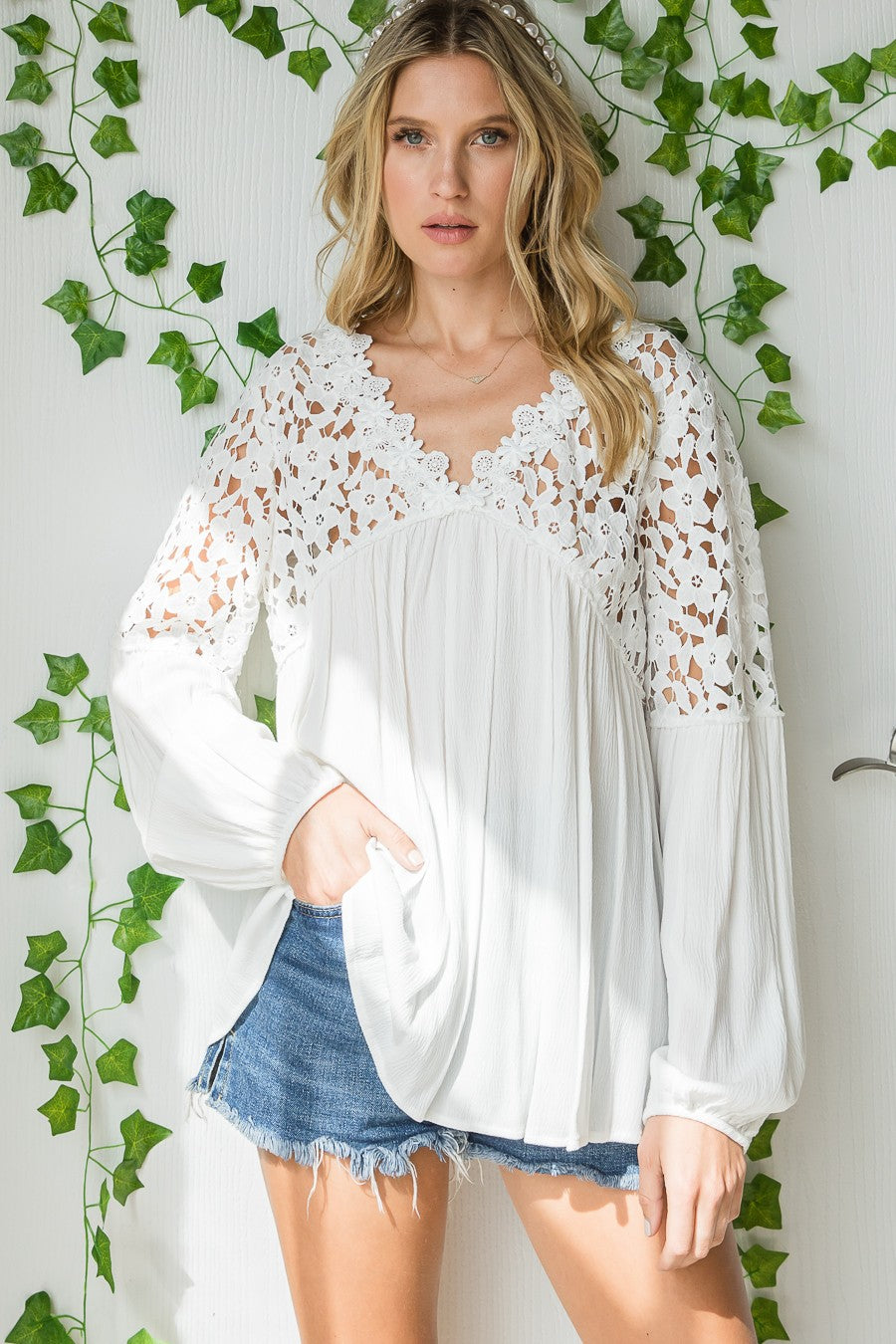 4919-V-Neck Floral Crochet Contrast Solid Blouse Top