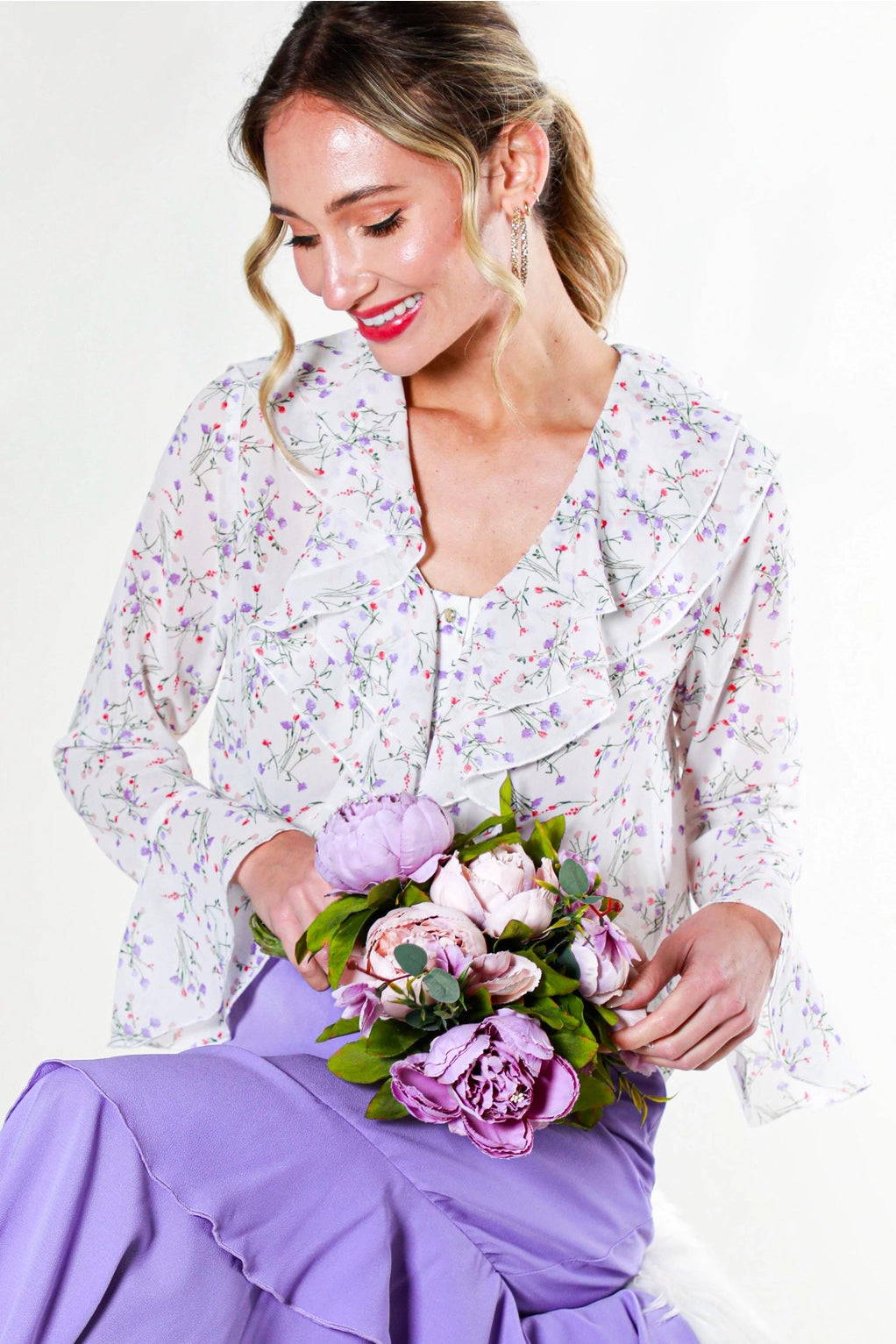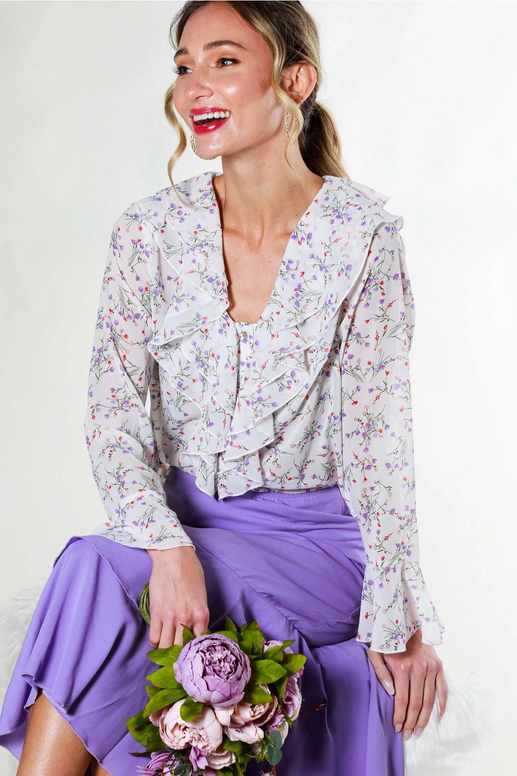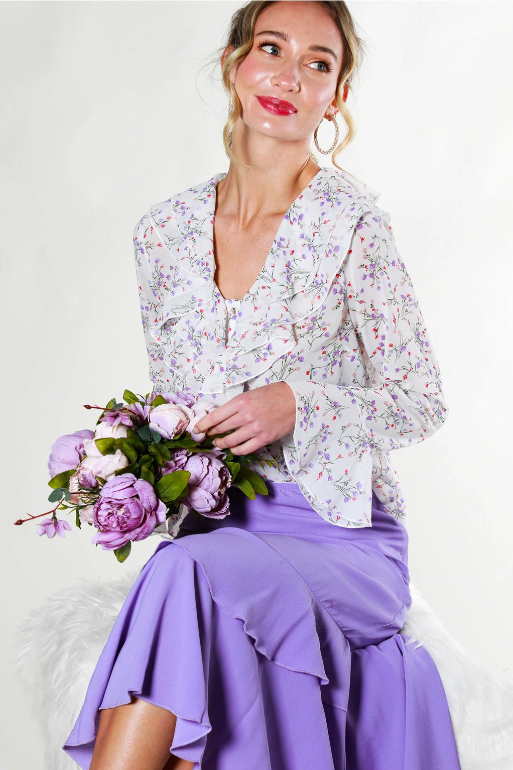 5041-V-Neck Ruffle Design Floral Chiffon Blouse -WHITE/LILAC