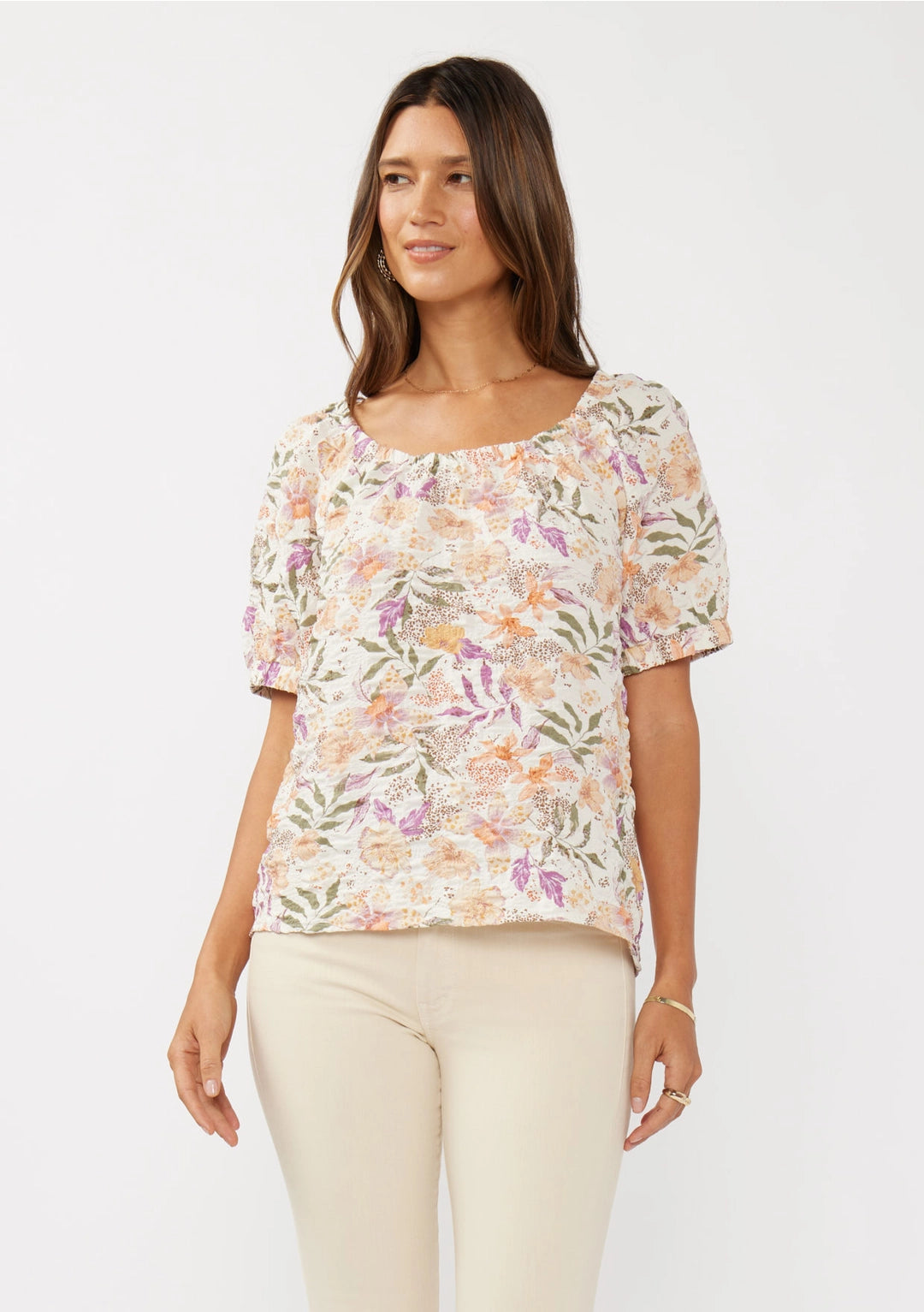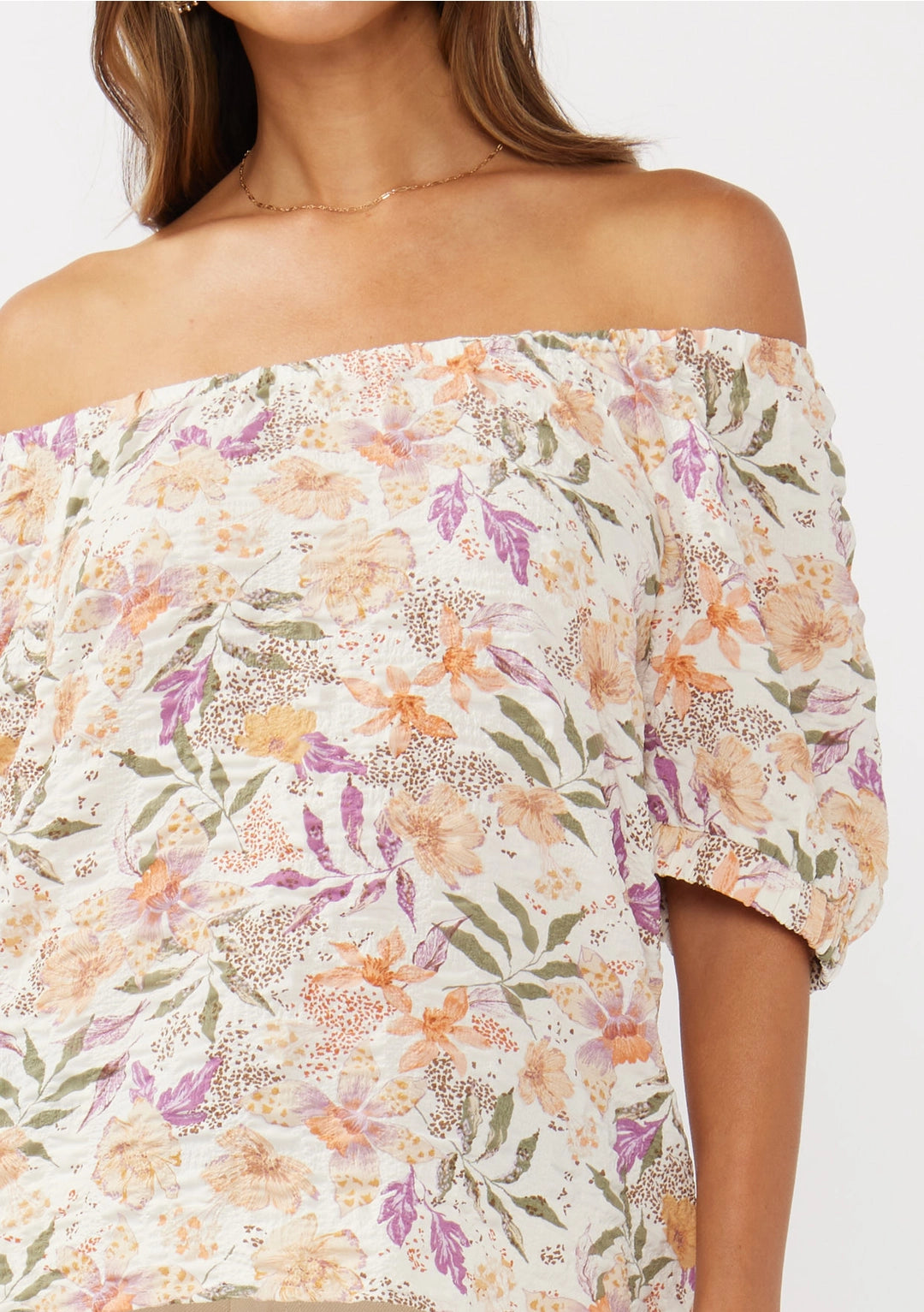 Add a touch of charm to your wardrobe with this short sleeve off-shoulder top in a vibrant poly-woven bubble print. Designed with an elastic neckline tunnel tacked at the raglan seams, elastic cuffs for a comfortable fit, and a straight bottom hemline, it’s a perfect choice for casual outings or warm-weather occasions.