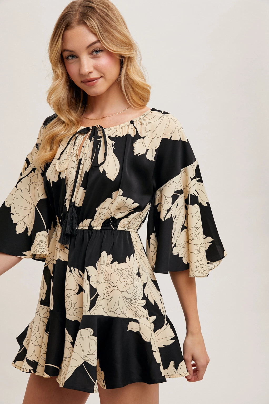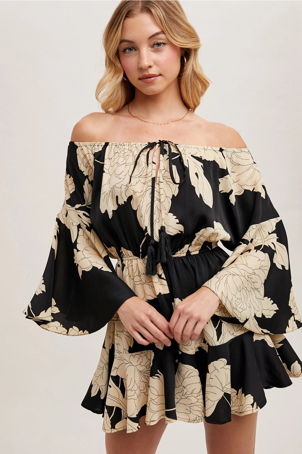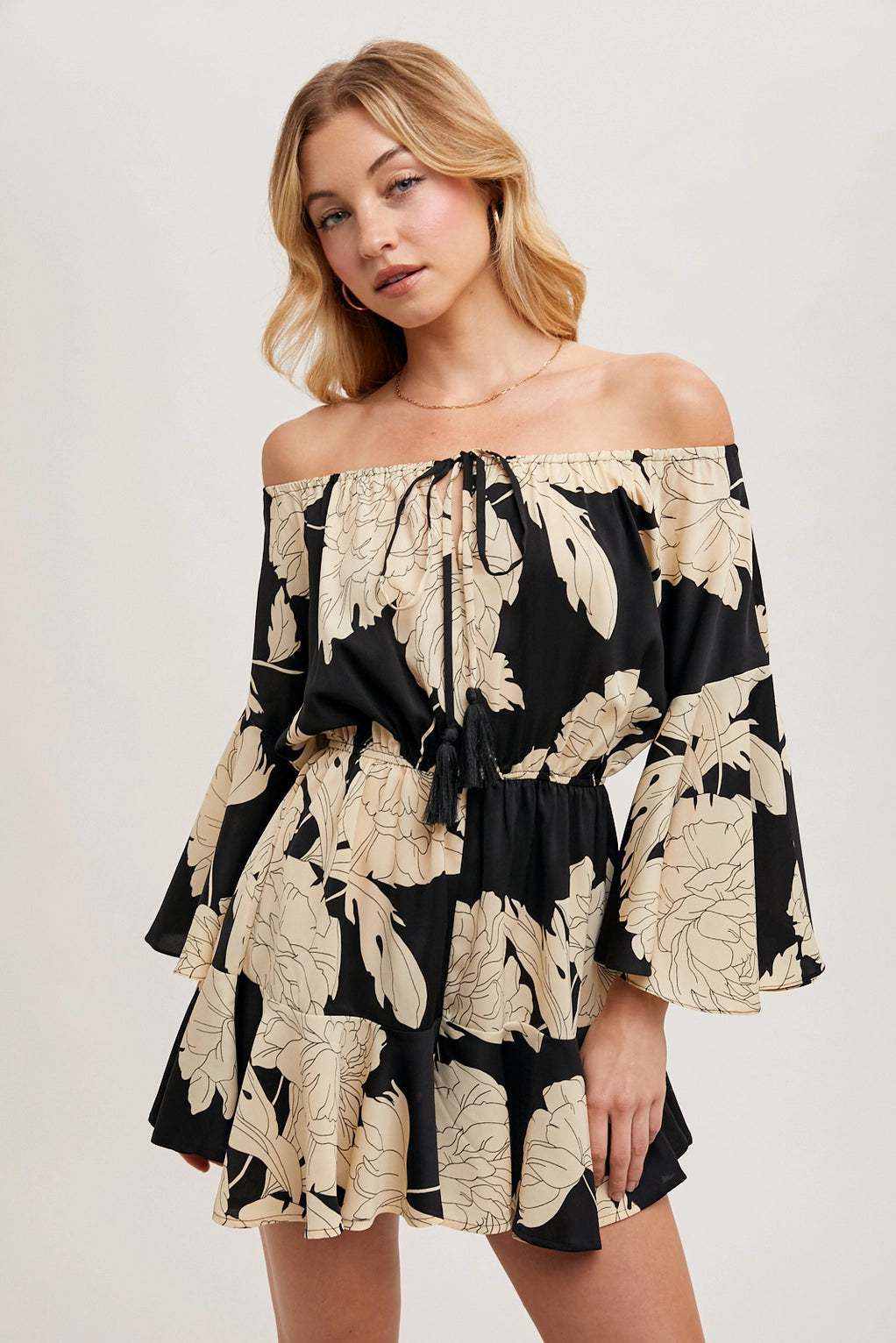 5091-Floral Print Off the Shoulder Bell Sleeved Romper
