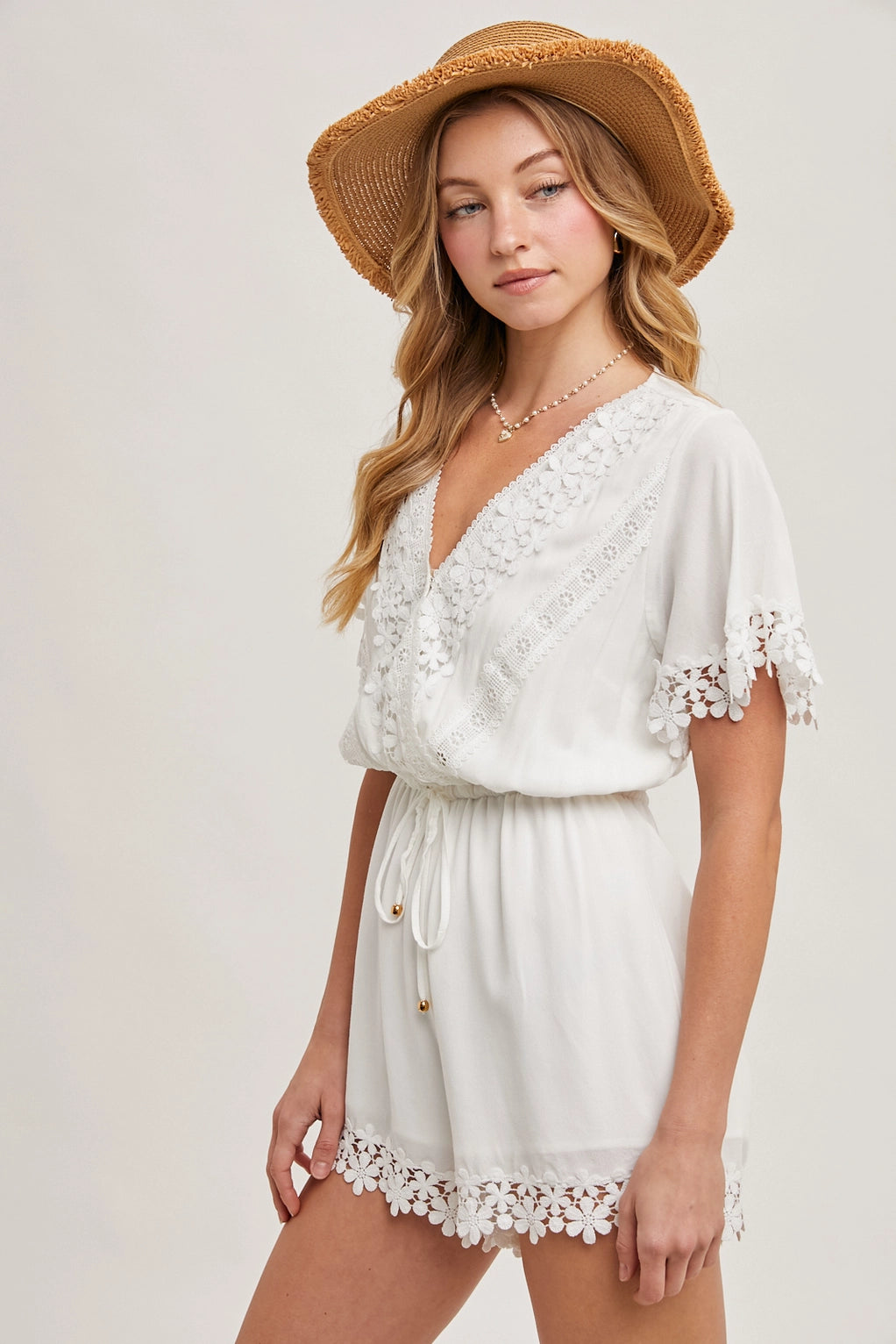 5092-Wrap Floral Lace Trimmed Drawstring Romper-IVORY