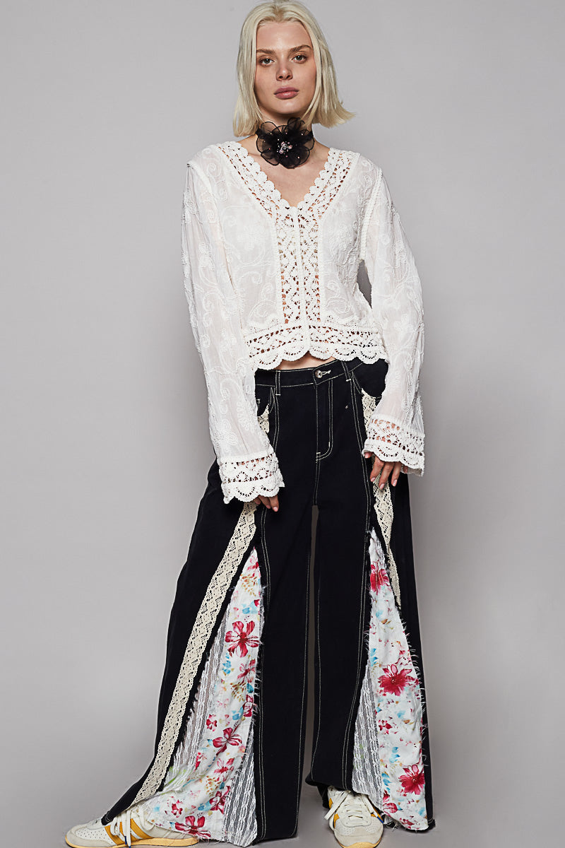 Designed in V-neck long sleeve cropped fit top in crochet with various weave knit patterns and floral embroidery detailing.