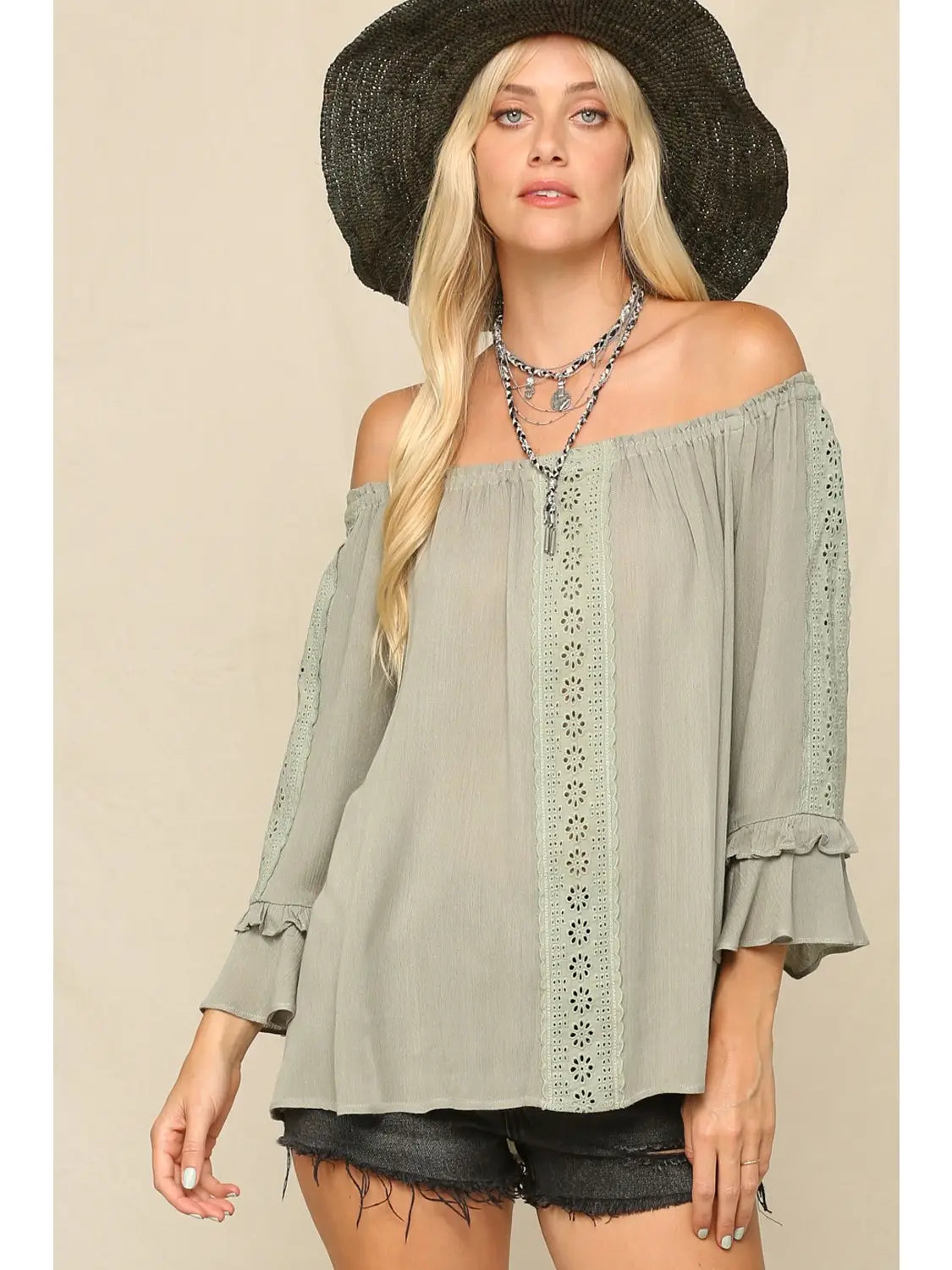 5152-Lightweight Flowy Top with An Off Shoulder-OLIVE