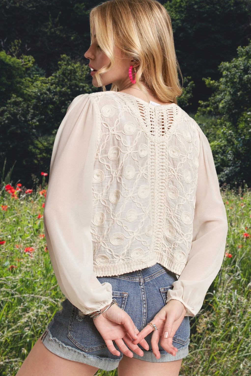EMBROIDERED BUTTON-DOWN WOVEN BLOUSE 75% COTTON 25% ACRYLIC *Sheer long sleeve *Button down *Embroidery, Embroidered