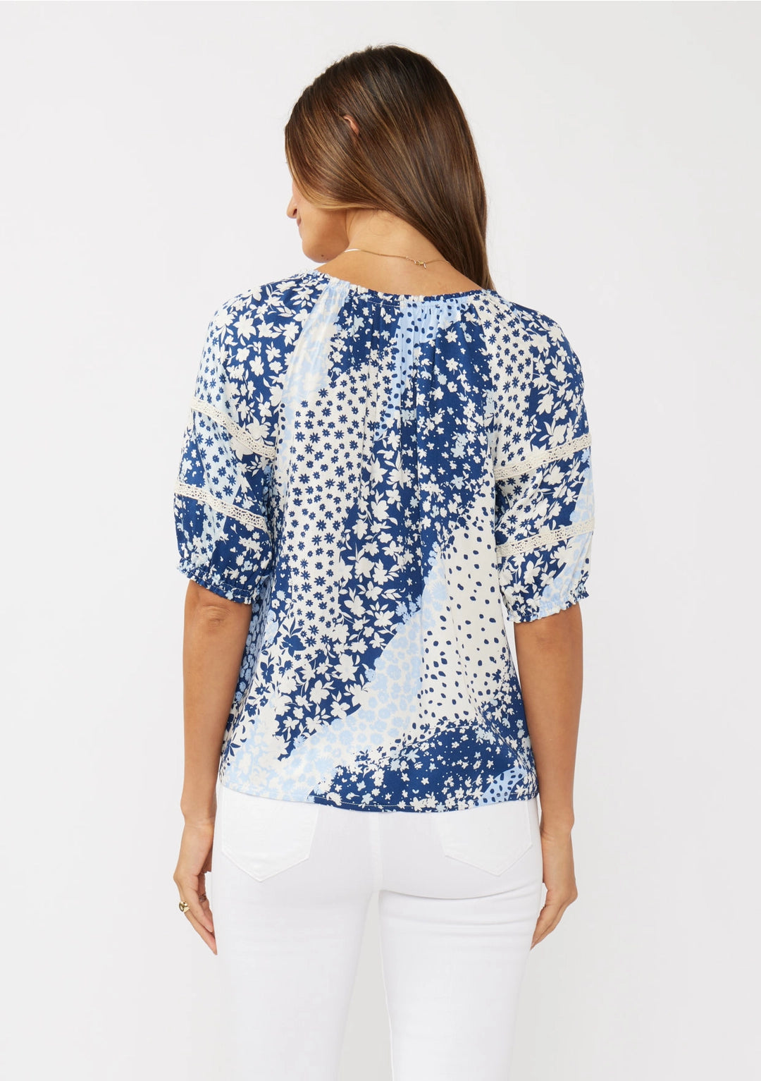 5192-Short Puff Sleeve V-Split Neck Top with Lace Trim-BLUE