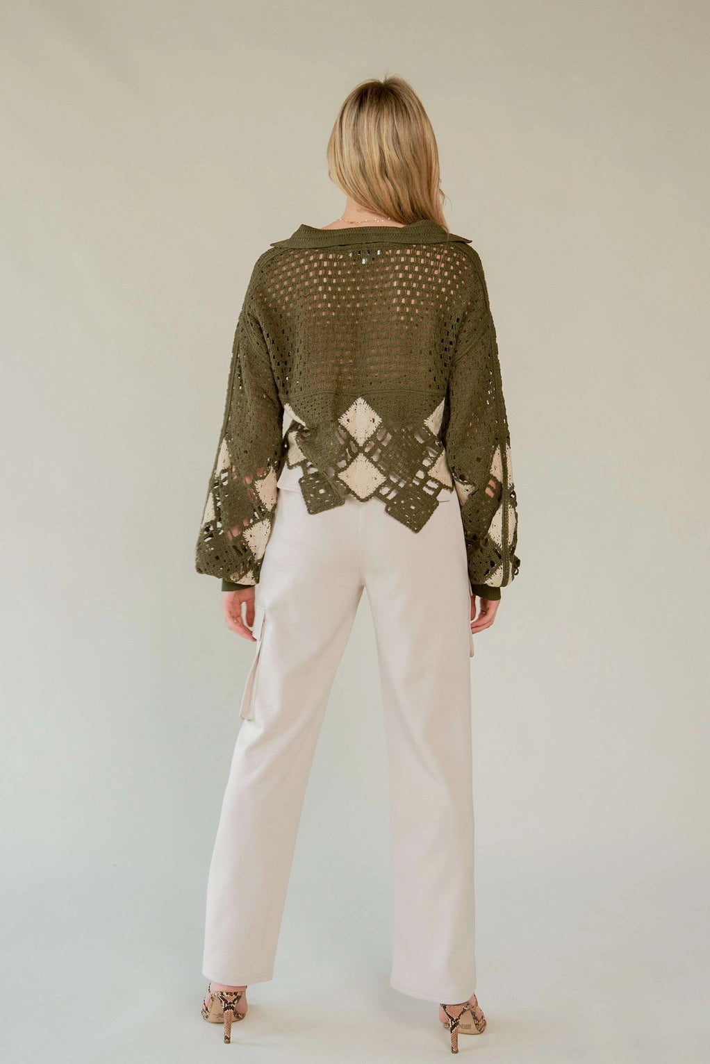 5235-Crochet V Neck Long Sleeve Knit Sweater Top-OLIVE