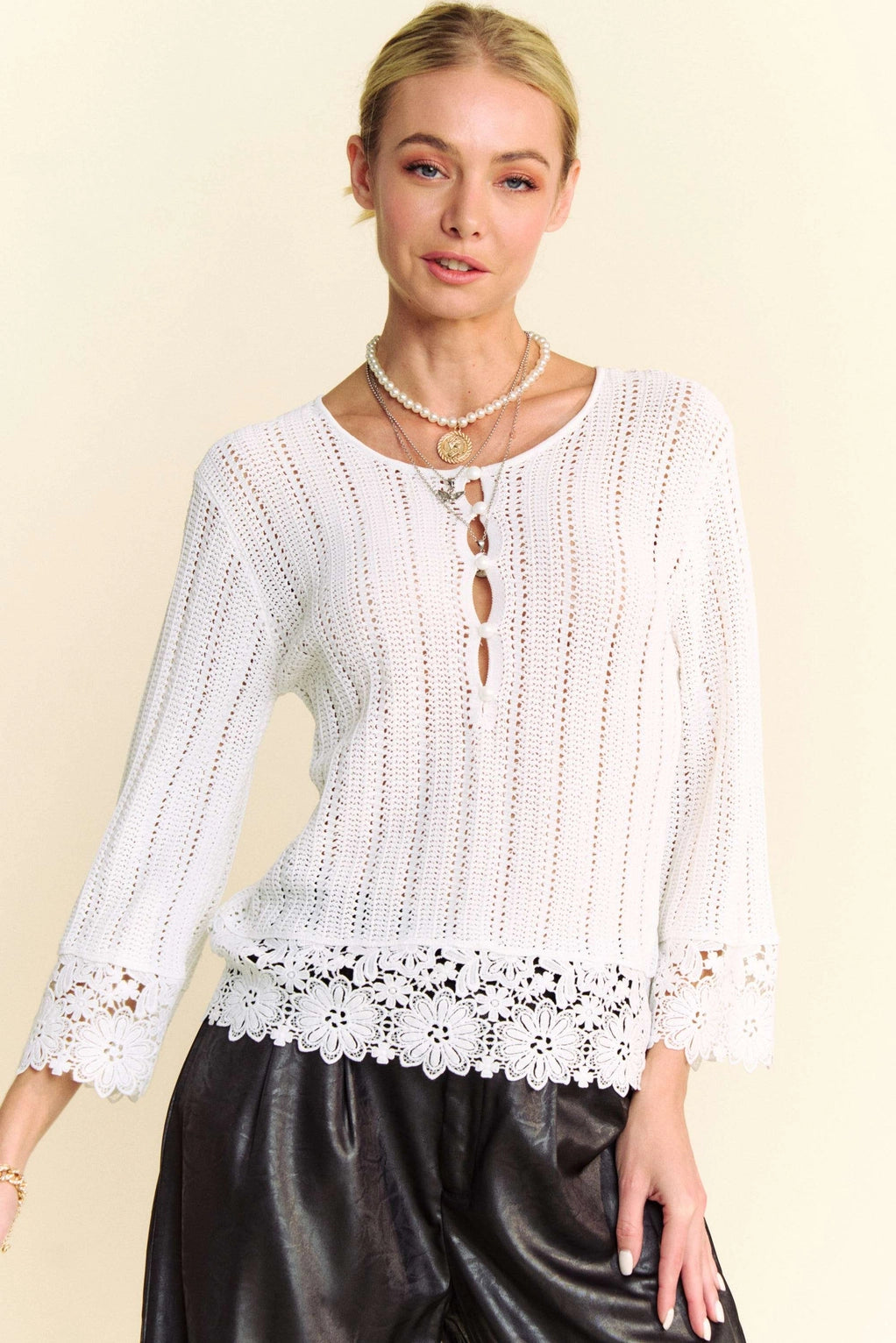 5240-Solid Crochet Bottom Detail Textured Knit Sweater-WHITE