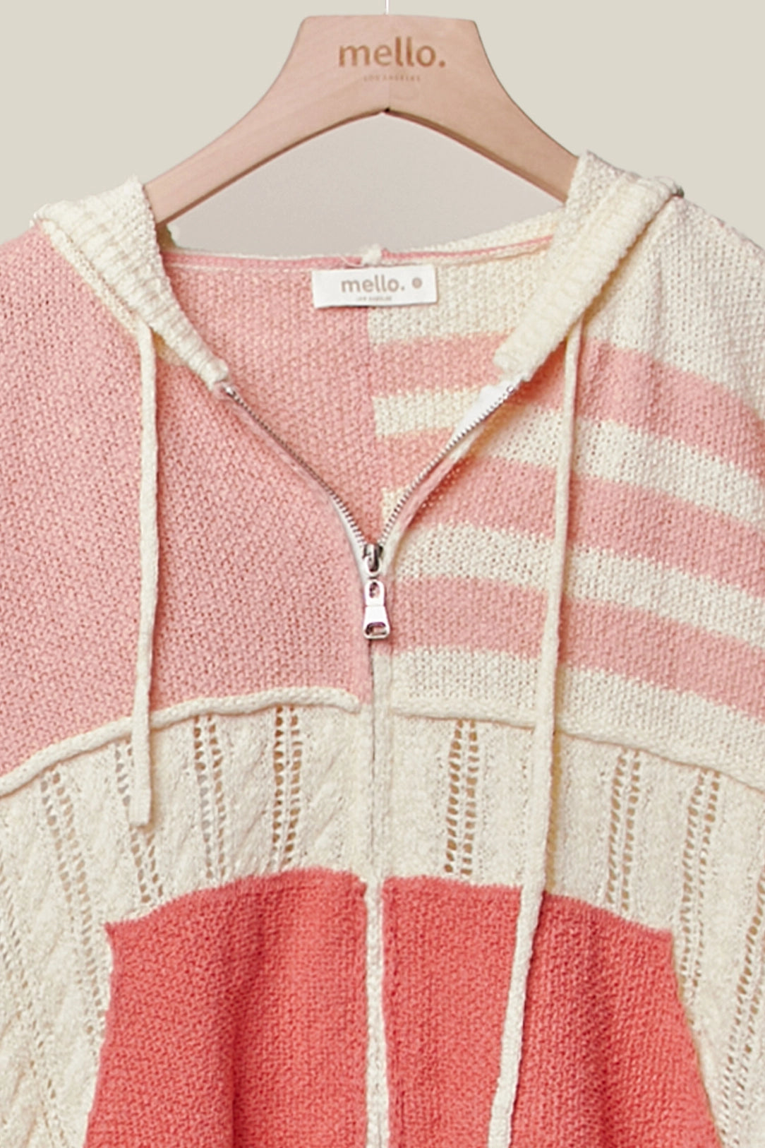 5349-Stripe Distressed Knit Hoodie-CORAL