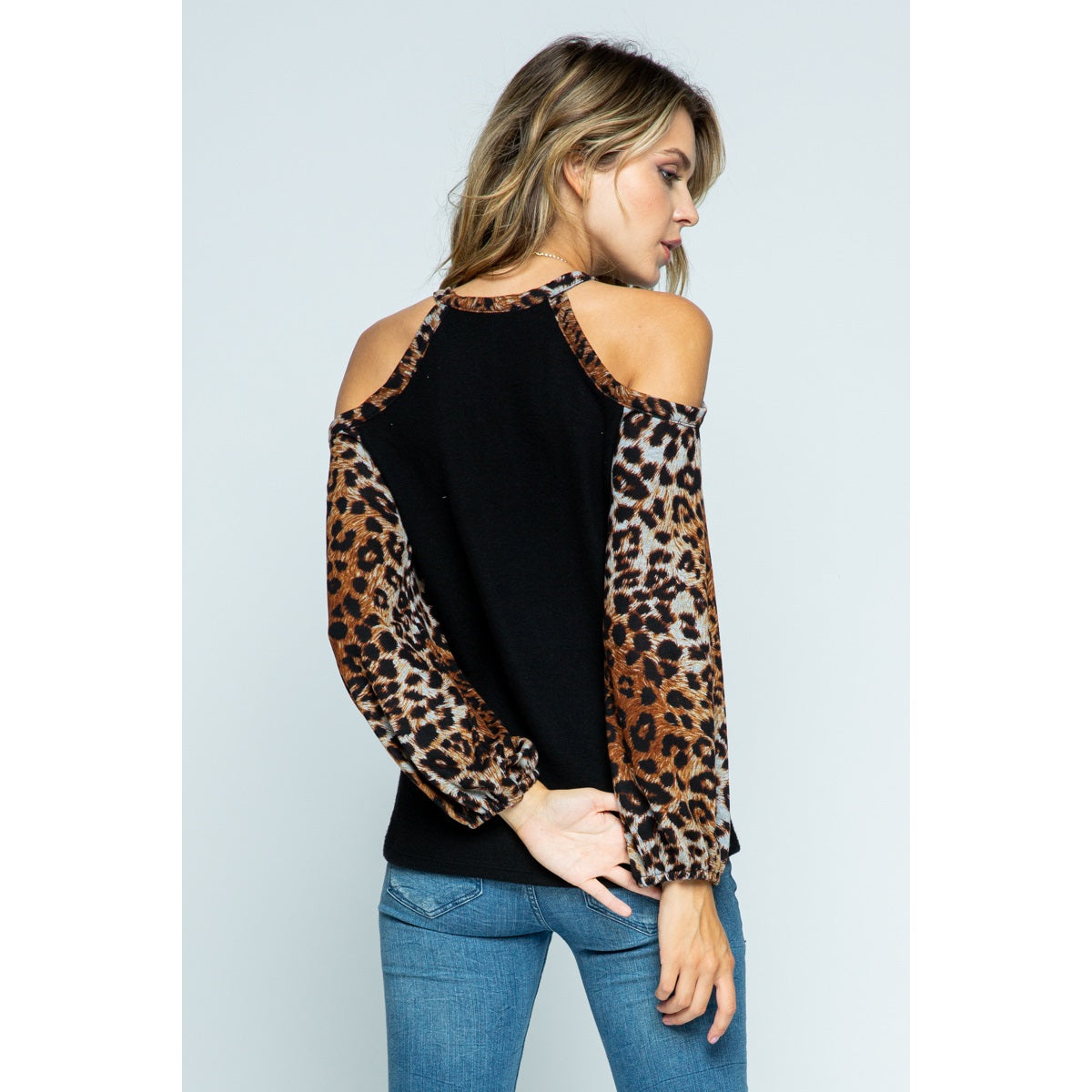5492- Cold Shoulder Long Sleeve Knit Top-BLK/BROWN