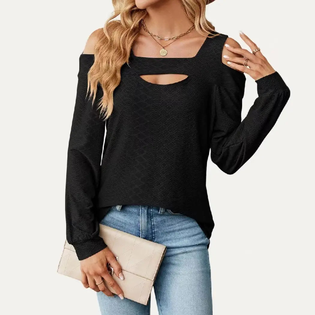 Chic Textured Square Neck Cold Shoulder Long Sleeve Top