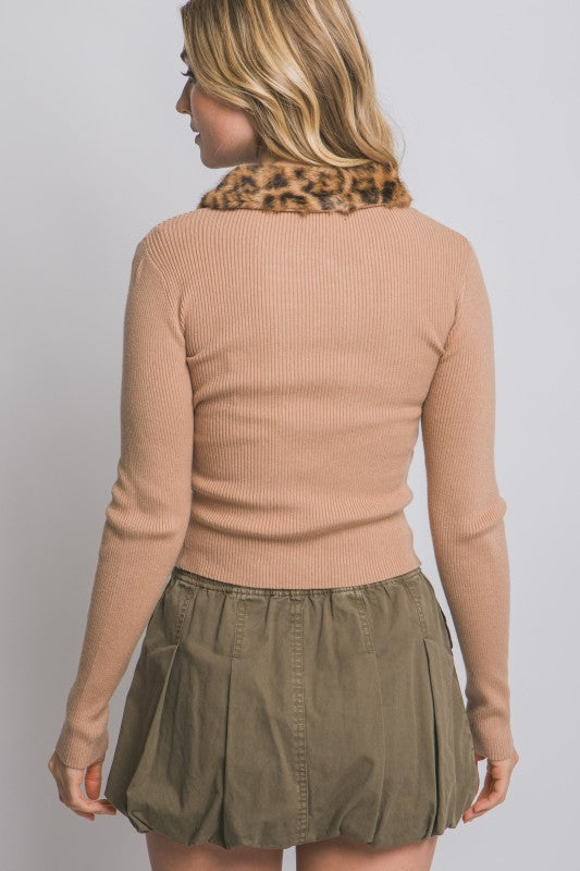 5573-Leopard Fur Collar Double-zip Cardigan-CAMEL