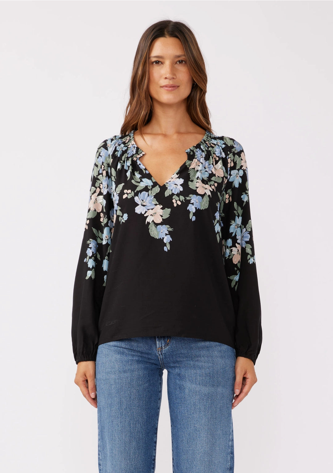 5590-Blue Floral V-Split Smocked Neck Blouse-BLACK