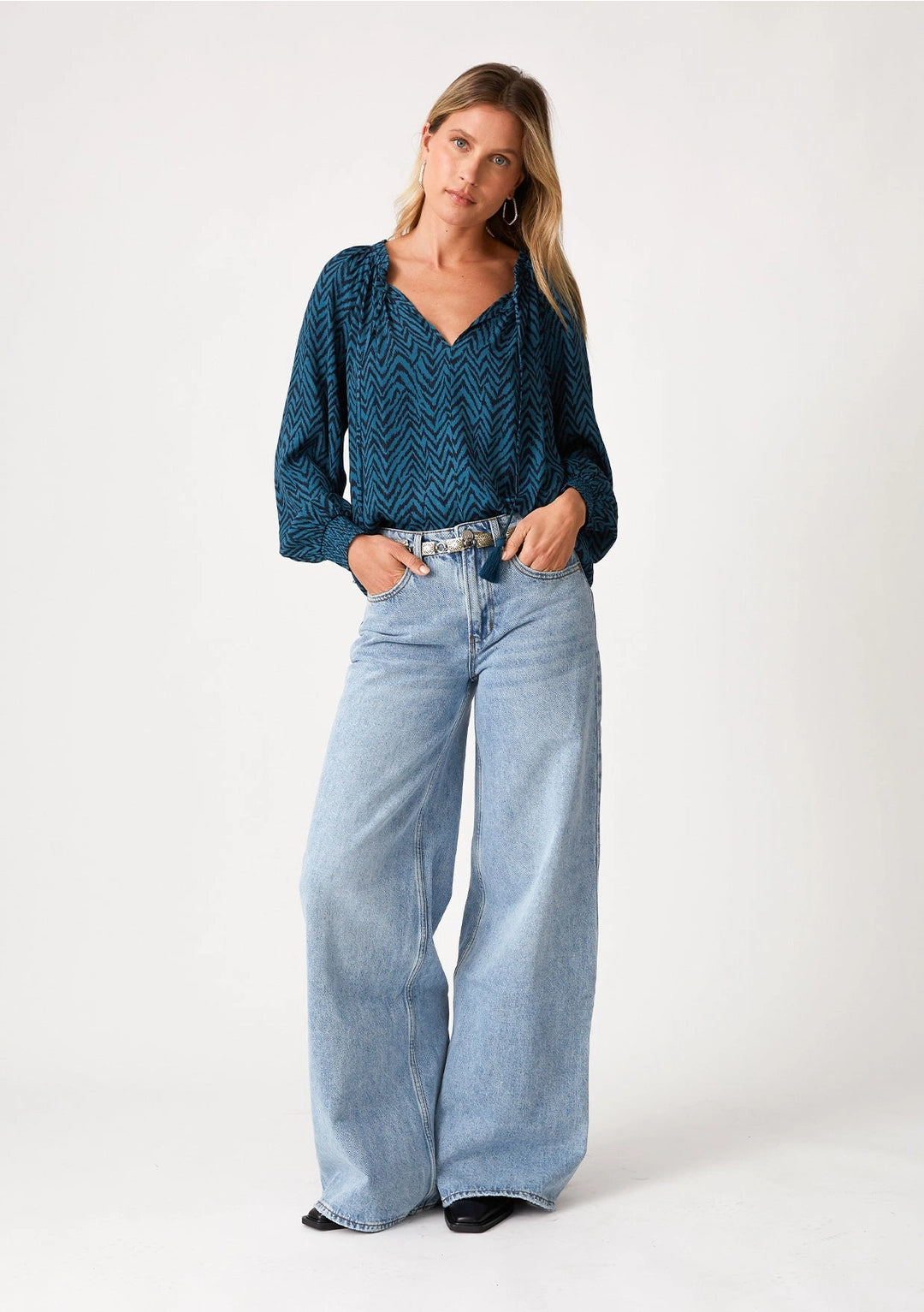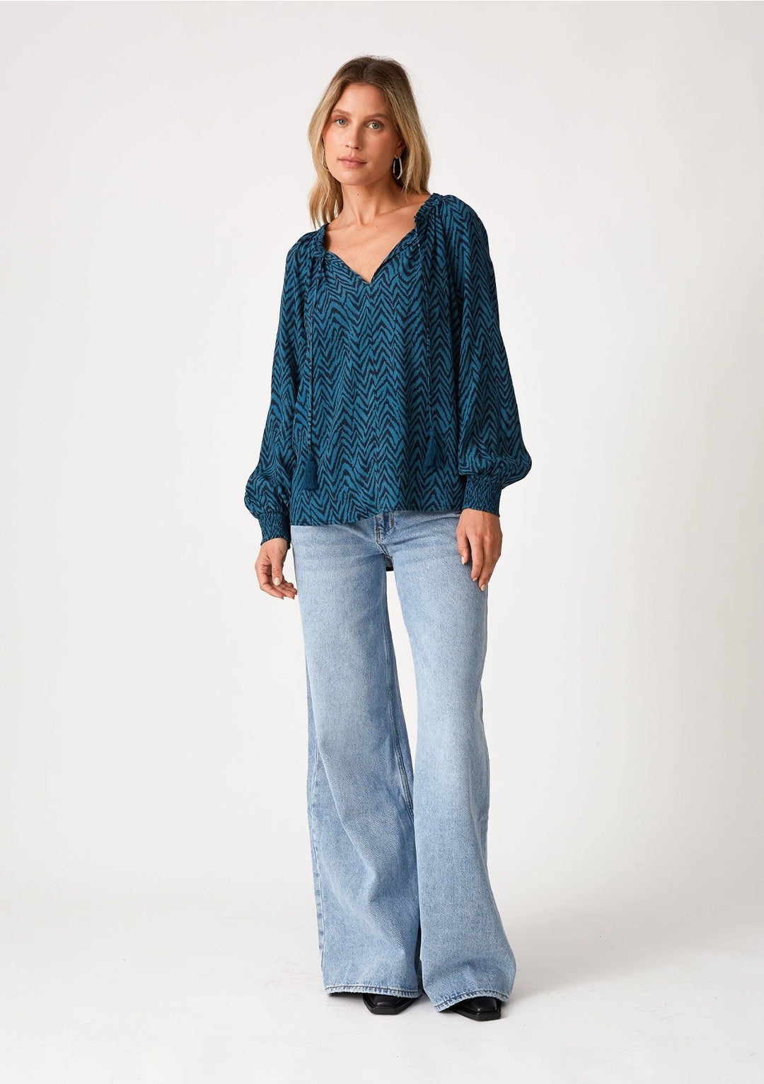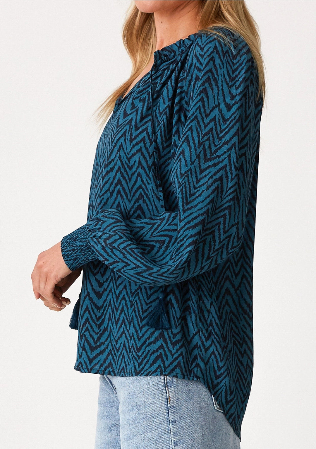 5592-Zigzag Long Sleeve Tie Neck Blouse-TEAL