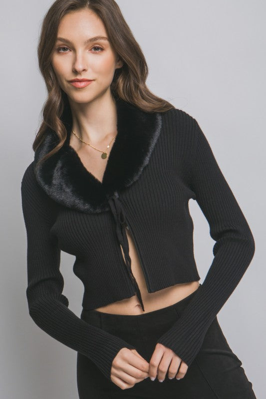 FEATURES: - Long Sleeve, Tie Front Closure, Cropped length & Unlined * DETACHABLE FUR COLLAR DETAIL * SIZE + FIT - Model is 5'9" 32C bust, 26" waist, and 36" hips. - Model is Wearing Size Small