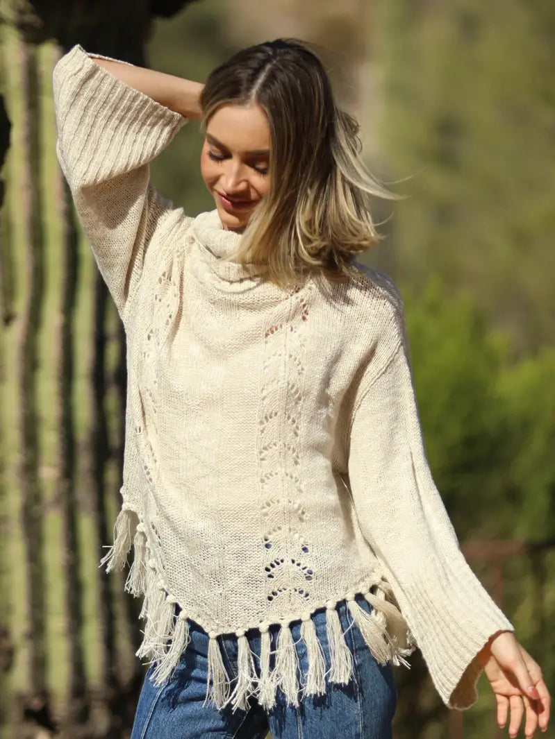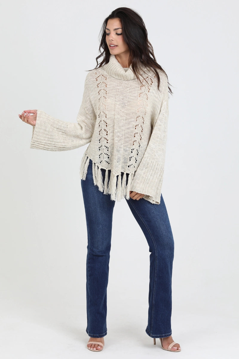 5711-Cowl Neck Fringe Hem Sweater-IVORY