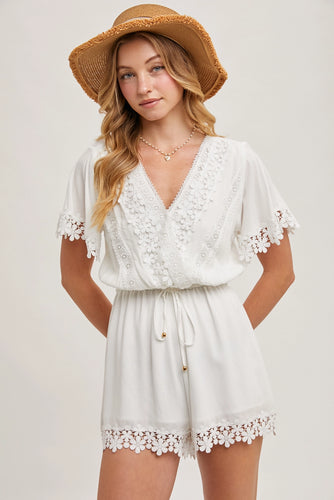 5092-Wrap Floral Lace Trimmed Drawstring Romper-IVORY