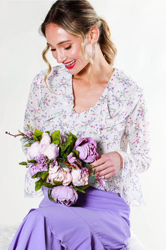 5041-V-Neck Ruffle Design Floral Chiffon Blouse -WHITE/LILAC