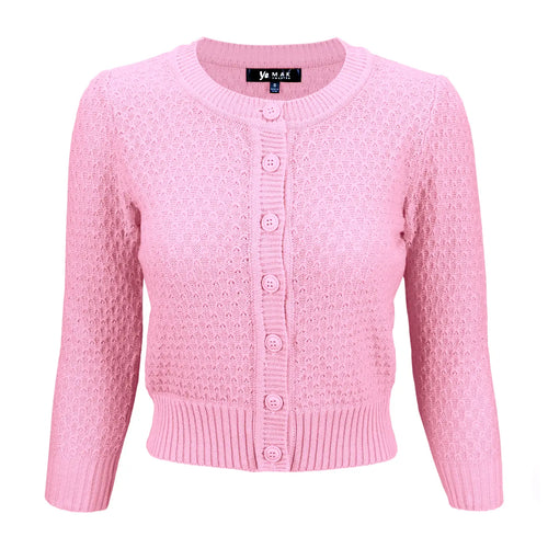 4953-3/4 Sleeve Crewneck Knit Cropped Cardigan Sweater -PINK