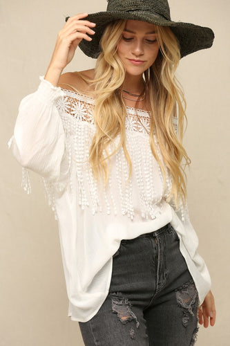 4455-LIGHTWEIGHT FLOWY TOP WITH FRINGE-WHITE