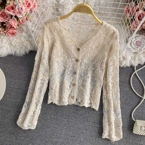 5384-Women's Lace Sheer Cardigan Shrug-BEIGE
