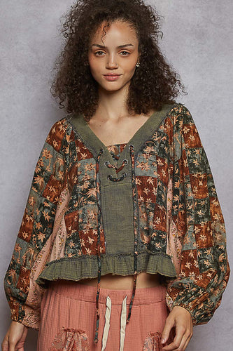 5484- POL V NECK BALLOON SLEEVE TOP-CHARCOAL MULTI