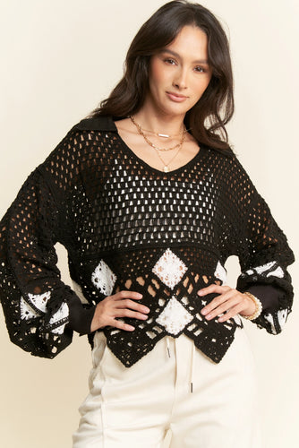 5234-Crochet V Neck Long Sleeve Knit Sweater Top-BLK